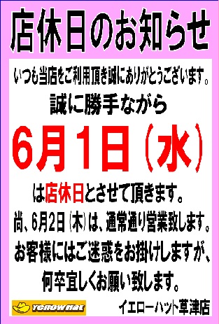 いつもイエローハット草津店をご利用いただきありがとうございます。 誠に勝手ながら、6月1日(水)を店休日とさせていただきます。 お客様にはご迷惑をおかけいたしますが、何卒ご理解賜りますようお願いいたします。 (2022/05/27up)