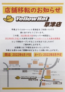 いつもイエローハット草津店をご利用いただきありがとうございます。 この度、イエローハット草津店は移転オープンの為、 6月19日(日)をもちまして閉店致します。 閉店に伴い売りつくし大処分セールを実施中です😊 なんと、、、、 【店内在庫品に限り10%OFF!!!】 (工賃、一部商品は除きます) ぜひこの機会に草津店へお越し下さい✨ (2022/06/03up)