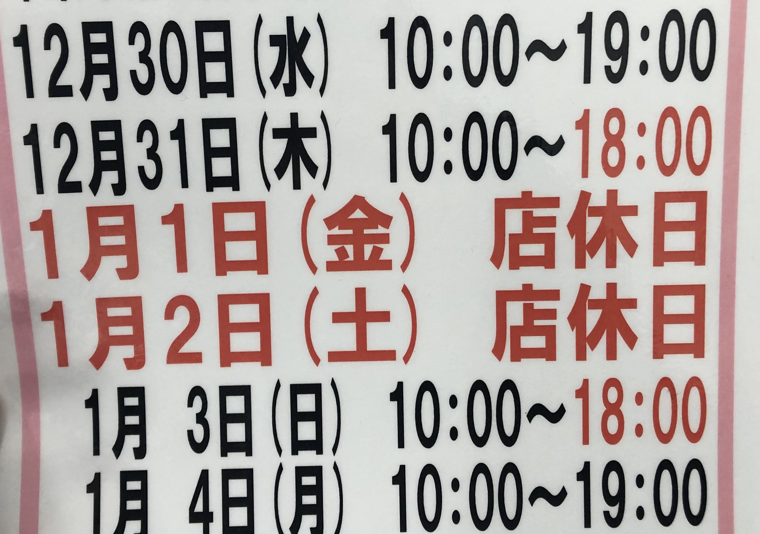 いつも当店をご利用いただき誠にありがとうございます。 年末年始の営業時間は以下になります。 12月31日(木)10:00〜18:00 1月1日(金) 定休日 1月2日(土) 定休日 1月3日(日) 10:00〜18:00 お客様にはご迷惑をおかけしますが、 何卒宜しくお願い致します。 (2020/12/29up)