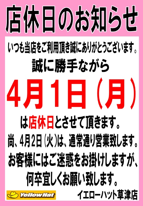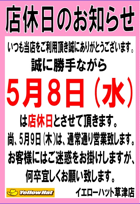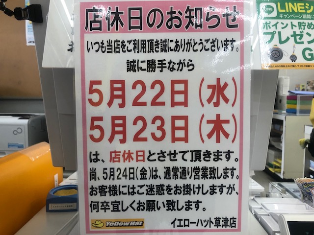 〜〜店休日のお知らせ〜〜 いつも当店をご利用いただき、誠にありがとうございます。 誠に勝手ながら、5月22日23日は店休日とさせて頂きます。 お客様には大変ご迷惑おかけ致しますが、何卒宜しくお願い申し上げます。 5月24日金曜日から通常営業いたします。 (2019/05/21up)