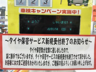いつもイエローハット草津店をご利用いただきまして、誠にありがとうございますヽ( ´ー`)ノ タイヤお預かりサービスですが、保管数が定数に達してしまいましたヾ(。>﹏<。)ノ その為新規のタイヤお預かりサービスを終了いたしました(〃ρ∩°`)ウゥ… お客様にはご迷惑をおかけいたしますが、ご理解の程よろしくお願いします。 (2018/01/14up)