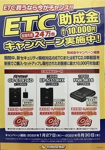 いつもイエローハット草津店をご利用いただき誠にありがとうございます! みなさま、1/27〜ETC助成金キャンペーンが始まっているのをご存知でしょうか?😲 最大10、000円の助成金、嬉しいですよね😄 先着24万台! 草津店でも続々お問い合わせいただいてます! ご自身のお車が対象になるのか? 気になる方は是非お気軽にスタッフまで! (2022/02/03up)