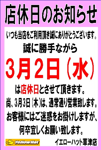 いつもイエローハット草津店をご利用いただきありがとうございます。 誠に勝手ながら、3月2日(水)を店休日とさせていただきます。 お客様にはご迷惑をおかけいたしますが、何卒ご理解賜りますようお願いいたします。 (2022/02/24up)
