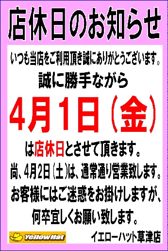 いつもイエローハット草津店をご利用いただきありがとうございます。 誠に勝手ながら、4月1日(金)を店休日とさせていただきます。 お客様にはご迷惑をおかけいたしますが、何卒ご理解賜りますようお願いいたします。 (2022/03/23up)
