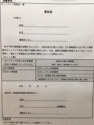 車両保有者に代わってETCセットアップされる皆様へのご案内です。 ORSEからの通達により、只今代理でのETCセットアップは車両保有者様からの委任状の提出および、代理の方の本人確認書類が必要となります。 大変お手数をお掛けいたしますが、委任状なき場合はセットアップできかねますので、何卒ご理解いただきますようお願い申し上げます。 ※ご家族間での代理セットアップは委任状がなくても承ります。 (委任状のひな形はORSEホームページからダウンロードいただけます。) LINK/ORSEホームページ (2016/06/21up)