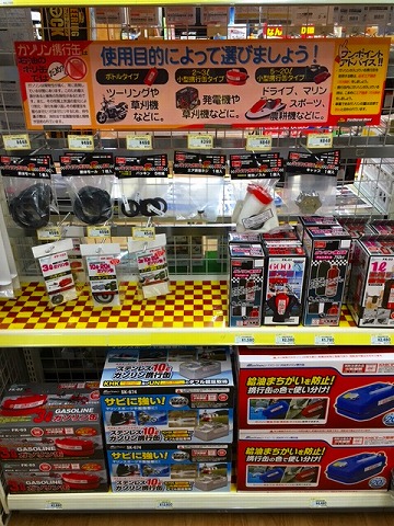ガソリン携行缶の売り場を新設いたしました〜〜〜ヽ(=´▽`=)ノ 農機具やバイク、発電機etc・・・さまざまなシーンでお使いいただけます♪ 小さいものはペットボトルサイズのものから、大型缶もございます・v・ 夏のレジャーのお供に携行缶はいかがでしょうか。 LINK/メルテック (2016/06/27up)