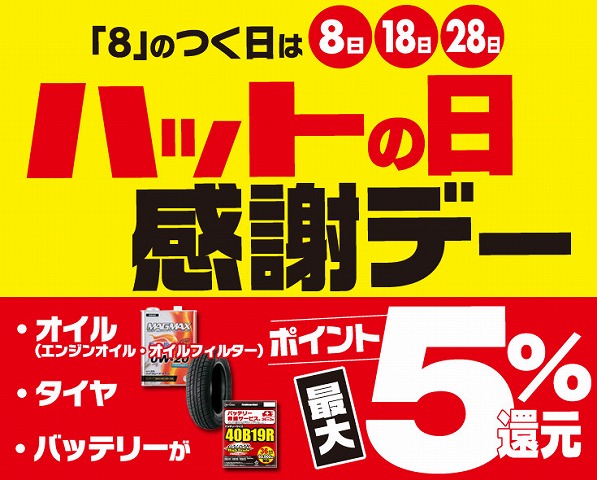 来る7月18日(月・祝)はハットの日♪ ポイントカード会員様が8日、18日、28日にエンジンオイル、オイルフィルター、タイヤ、バッテリーのいずれかをご購入いただきますと、もれなくポイントが最大5%付与されますヽ(´エ`)ノヽ(´エ`)ノ♡ 青色のカード会員様はいつもの2倍、黄色のカードならびにクレジット会員様はいつもの2.5倍!!!!!! 3連休、お盆直前、この機会にお車のメンテナンスはいかがですか??(・∀・) LINK/タイヤで選ぶならイエローハット♪ (2016/07/14up)