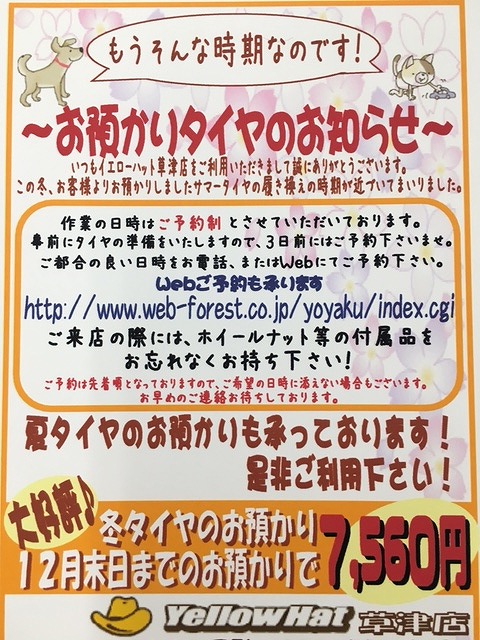 夏タイヤへの交換時期がそろそろきています。 夏タイヤをお預かりしておりますお客様には、本日ご案内のハガキをお送りいたしました・v・** このホームページと、お電話にてご予約を承っております^_^ ※3月になると、ご予約の枠が埋まり希望の日時に添えない場合がございます。先着順となっておりますので、お早めのご予約をオススメいたします。 (2016/02/25up)