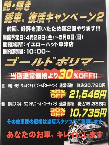 前回ご好評いただきました”愛車復活キャンペーン”を5月8日(日)まで実施中です♪ ぬゎんと、当店通常価格から30%オフ!!!♪ 雨、風、黄砂にホコリ、花粉に虫。。。今までダメージを多々受けてきたあなたの愛車をピカピカに蘇らせましょう(・∀・)☆ 車種によって価格が異なりますので、スタッフにご相談下さいませ(*´∀`) (2016/04/20up)