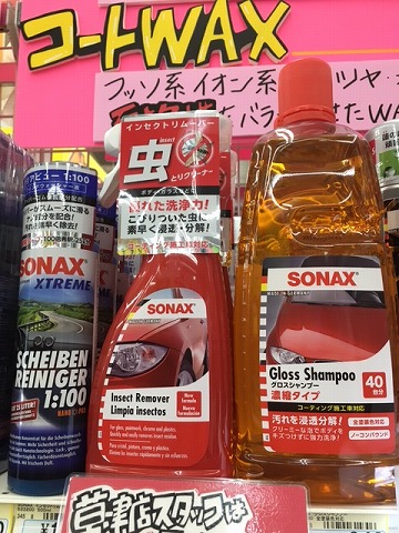 みなさんの愛車はキレイですか(・v・)?? 雨や黄砂でドロドロになってはいませんか??(# ゜Д゜) 温かい今は、絶好の洗車シーズンです♪ 日頃お世話になりまっくている愛車をピカピカにしてあげましょう★ そんな時はSONAX(ソナックス)のシャンプーがおすすめです!! ◎泡立ちよし ◎泡切れ良し ◎愛車のボディカラーを問いません!! コーティング施工車にももちろん、お使い頂ける当店スタッフイチオシのシャンプーです★ 頑固な虫汚れには、虫取りのクリーナーもございます・v・☆ シリーズで揃えてみられてはいかがでしょうか?? LINK/SONAX (2016/05/12up)