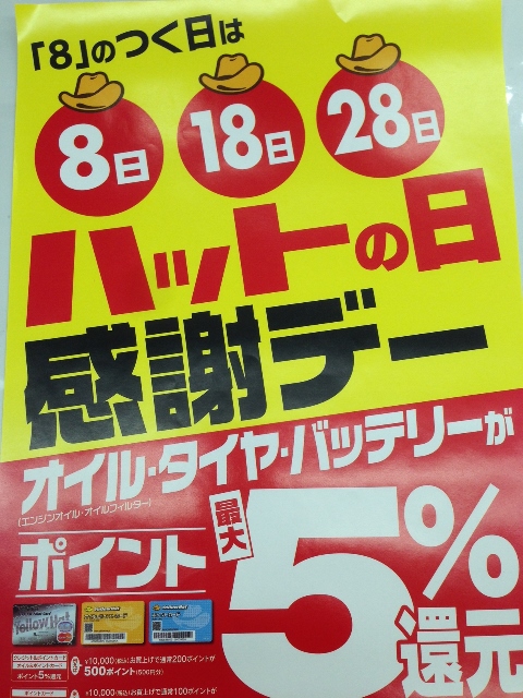 この日にオイル、タイヤ、バッテリーご購入いただいたお客様にポイント最大5%付与いたします(・∀・)!!!!!!!