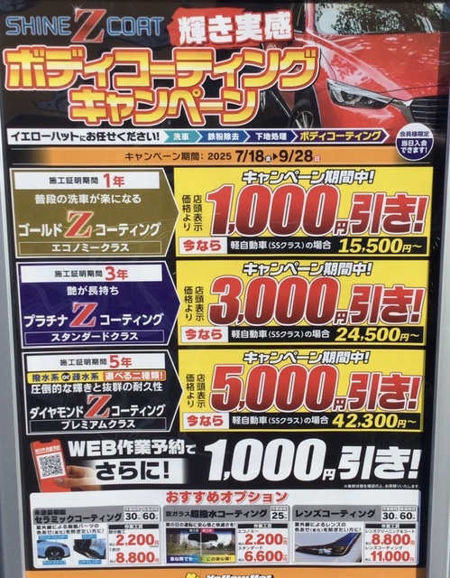 いつもイエローハット近江八幡店をご利用頂きありがとうございます🤗 只今イエローハットではボディーコーティングキャンペーンを実施しております🚙✨ 各種ボディーコーティングが通常価格よりもお得に行えるチャンス‼️ ウェブ予約でさらにお得にコーティングが行えるのでウェブ予約がかなりお得になっております‼️ 期間は9月28日(日)までとなりますのでこの機会に是非✨✨ (2025/08/10up)